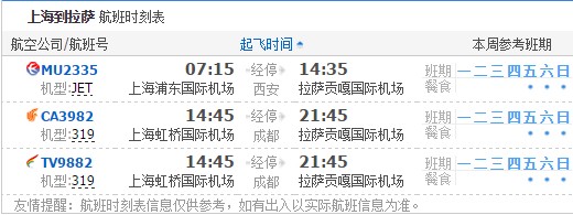 以上就是上海飛拉薩的航班時(shí)刻表,起飛時(shí)間,到達(dá)時(shí)間,及固定航班日期。