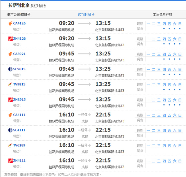 以上就是拉薩飛北京的航班時(shí)刻表,起飛時(shí)間,到達(dá)時(shí)間,及固定航班日期。