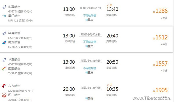 1、邯鄲去拉薩的航班