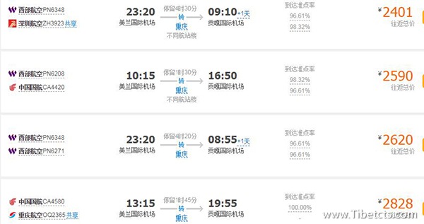 中轉(zhuǎn)航班:查詢(xún)2020年5月9日,無(wú)直達(dá)拉薩的航班,可以選擇在重慶、西安、成都等地?fù)Q乘,如選擇在重慶換乘,往返費(fèi)用約2590元,其具體換乘方式如下: