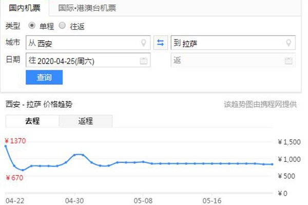 查詢2020年5月4日,當(dāng)天西安到拉薩的直達(dá)航班有8趟,分別是四川航空3U8687、東方航空MU2333/MU9619/MU2335、西藏航空TV6018....。其中四川航空3U8687從咸陽機(jī)場(chǎng)的出發(fā)時(shí)間為07:50,停西寧,到達(dá)拉薩貢嘎機(jī)場(chǎng)的時(shí)間為12:15,全程約4小時(shí)25分鐘,機(jī)票折扣價(jià)為800元;東方航空MU2335從咸陽機(jī)場(chǎng)的出發(fā)時(shí)間為11:20,到達(dá)拉薩貢嘎機(jī)場(chǎng)的時(shí)間為14:35,全程約3小時(shí)15分鐘,機(jī)票折扣價(jià)為1135元。