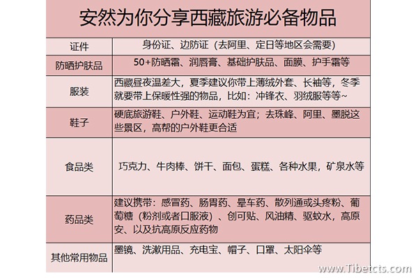 應(yīng)急藥品最好帶一些:抗高原反應(yīng)的藥物(建議藥店咨詢)、感冒藥、退燒藥、創(chuàng)可貼、消炎藥等等。這些你們根據(jù)自身的身體狀況來準(zhǔn)備就好了;